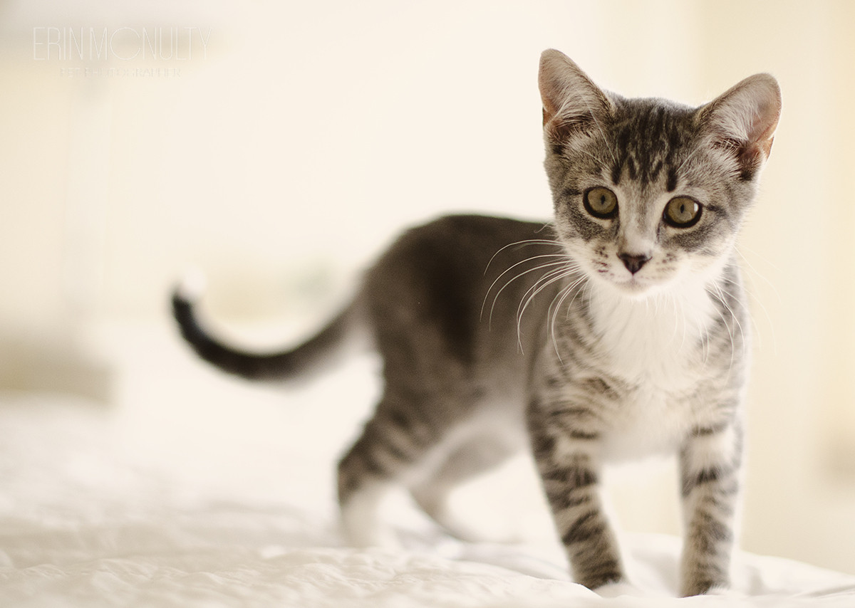 Lucinda is a sweet, happy grey tabby who loves chasing string, playing with her foster brother, and cuddles with her foster mum. She has the prettiest little white paws, bib and tip of her tail and a lovely stripy tummy.