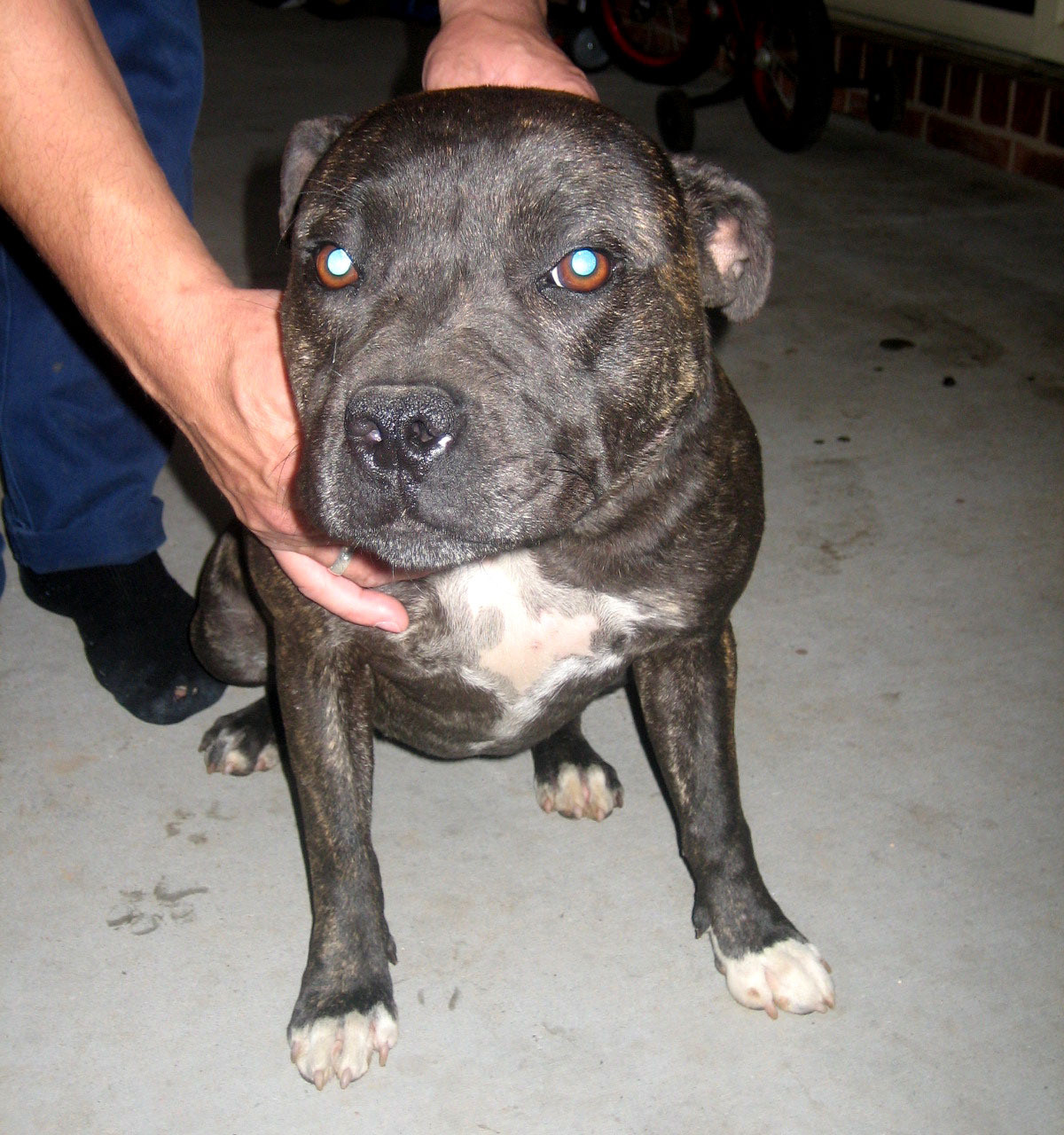 Hi, my name is Dakota and I have a sorry little past for one so young. I was taken away from my first abusive family and rehomed with new owners who have another female Stafford. I am well fed there but we are not allowed inside and at night sleep in a dog run.