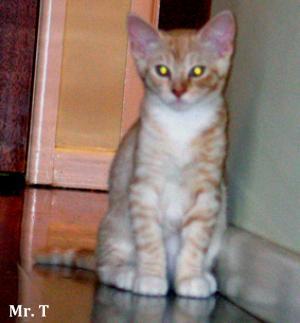 Mr t was an orphan who was very small when he was came with cleopatra. . We were very worried that he would not make it through the first 3 days but cleo took on feeding him. . We called him mr t as a short name for mr tough because of how hard he fought to live. . He is a very quiet cat and can be timid and frighted by loud noises and people. . During his time with us we have watched him grow more confident each day. . He likes having the other cats around and would be best either if hannah goes with him or if your house already has another kitten or young cat for him to be with. . He is an adorable little man!
