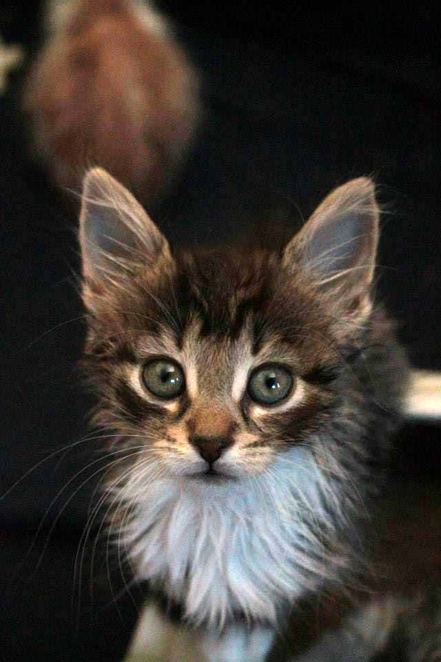 Ali is a gorgeous little tabby girl with big eyes, a white chest and tummy, and little white paws.