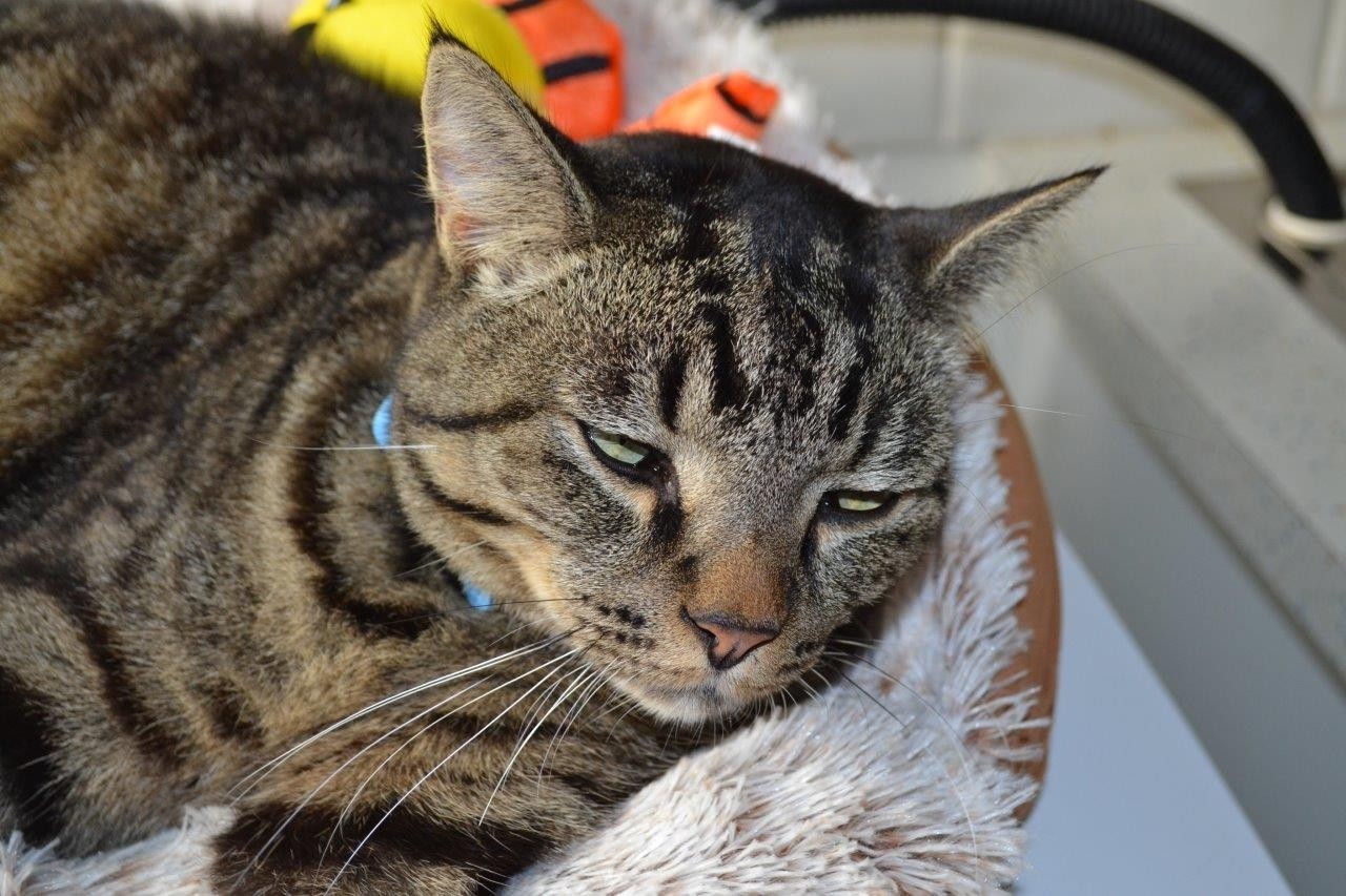 Pete is a great cat. He has no fear of dogs and is dog friendly. He settled in easily to his new foster home and is now relaxed and happy. Pete loves company and would be excellent in a family situation with someone who is a stay at home mum or someone who works from home.