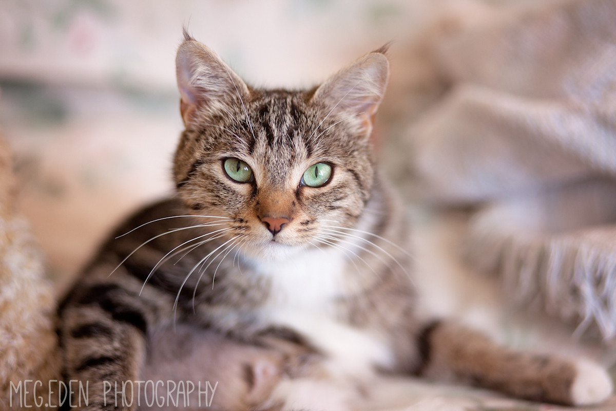 Sleeps on the bed at night, with her babies or any other available kittens (she is a natural mum). Is just a big kitten herself, plays constantly.