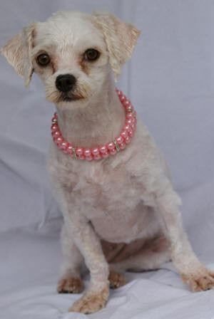 Like many of the fluffy dogs we rescue, Zara's coat was filthy, matted and flea ridden and so it was not surprising she was not adopted straight from the Pound looking like she did. As luck would have it, PAWS were notified about Zara's existence by a kind lady who saw her down and out in a run at the Pound and asked if we would her. Of course we would! Zara has now been cleaned up, had all of her routine vet work done and is now in foster care. What a picture she is in her pink pearls ... a far cry from the matted mess that was sitting in the run waiting for someone, anyone to come and get her out! Zara is happy these days and in foster care with a young couple who are active and can take Zara with them to work each day so that she is not alone. She goes for runs on the beach with them and has lots of human company. Zara is a house dog that is house trained and her new home should be with a family who have another little dog for company should they go out to work each day, or with a retired couple or 'stay at home' mum who has the time to spend with Zara and not leave her alone for long periods of time. Zara will be absolutely beautiful when her coat grows again. and will require regular grooming and bathing to keep her looking great,