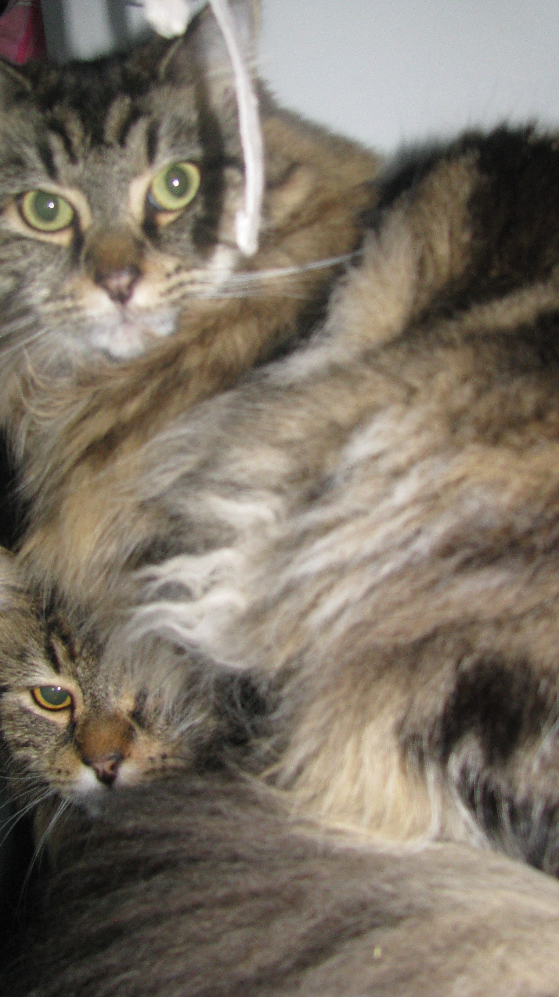 She loves to sit with you or have a pat. She will allow you to pick her up when she gets to know you. She is not a lap cat but likes to be near you or will sleep beside you, sometimes. \ They both love to play with ticklers and chase one another.