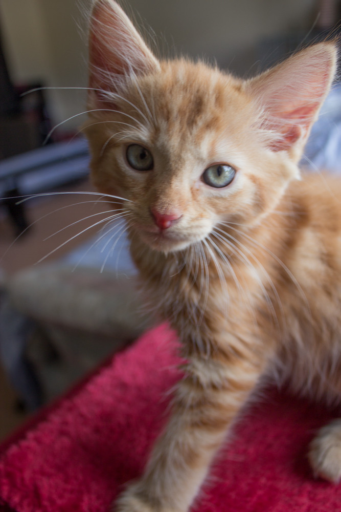 Leo is a stunning little guy rescued from the pound along with his brother Tommy. He is a sweet and gentle boy, and purrs as soon as you pat him. He is affectionate and gets on really well with other kittens. He has the most beautiful bright orange soft medium length coat.He has a sweet little pink nose and bright pink paw pads. He has the cutest little high-pitched squeak it's adorable.