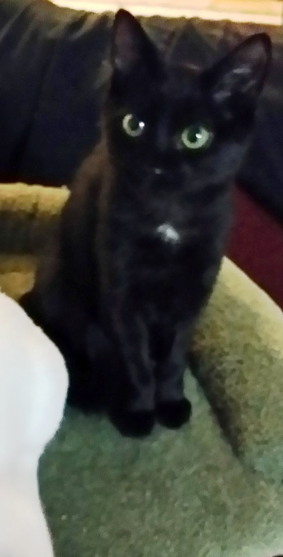 Barry is black with a white patch on his lower chest. He can be quite affectionate and has a high pitched meow that is often just a plea for attention. He's a bit fussy with his food but will come over to eat eventually. He is very relaxed when he has to travel in the cat transport box. He has a very loud purr and is well toilet trained!