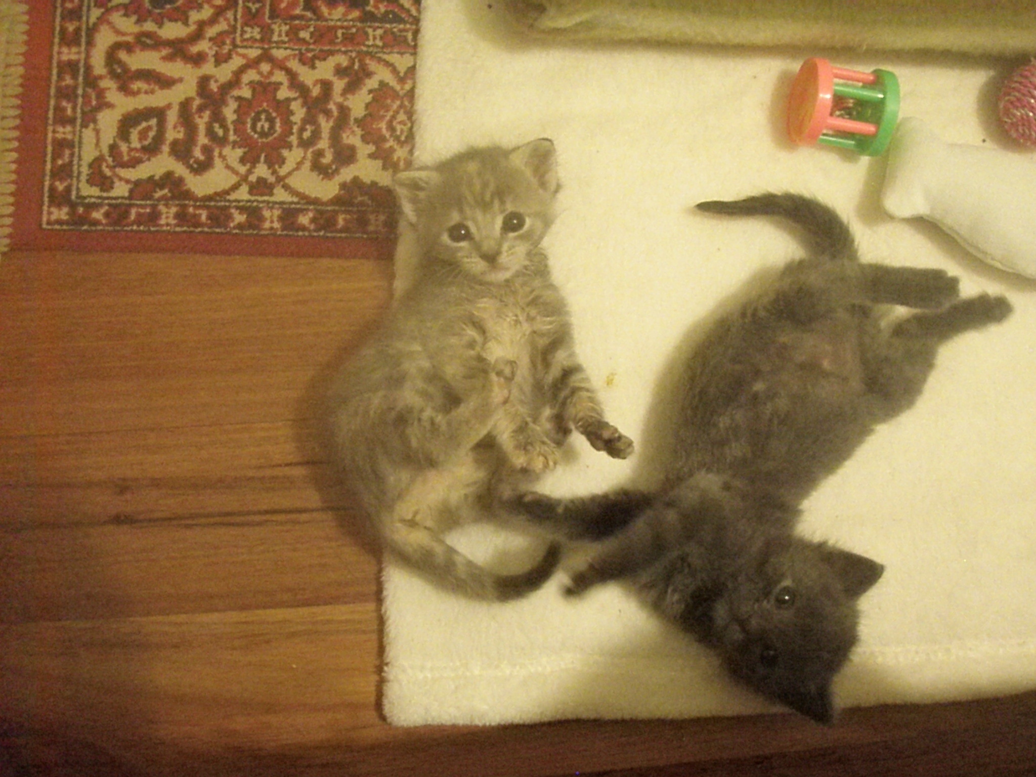 (Petal is the kitten on the left in the photo, a lovely grey tabby with an orange spot on her forehead)