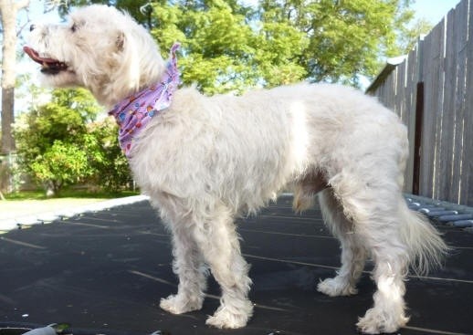 Sweet Carter has not had a great start in life as he was part of a seizure of several dogs from a very bad owner and was black with mud, flea ridden and extremely thin from lack of food. Carter is now trimmed and actually white (now that he is finally clean and free of fleas) but still very thin and requires lots of yummy food and love to get him back to normal. Carter is a little timid, but really he is just a very gentle and quiet soul who does love a cuddle and to curl up on your lap. He has lovely long legs and weighs around 7kg so is heavier and taller than your standard Maltese X dog. Carter needs the company of another easy going, friendly young dog for company and to teach him how to play. He would ideally suit a quiet home where he will get regular daily walks and lots of attention to make up for his sad past. Carter's house training is going well and he must have access to the house at all times. He has a low shedding coat that will require regular professional grooming.