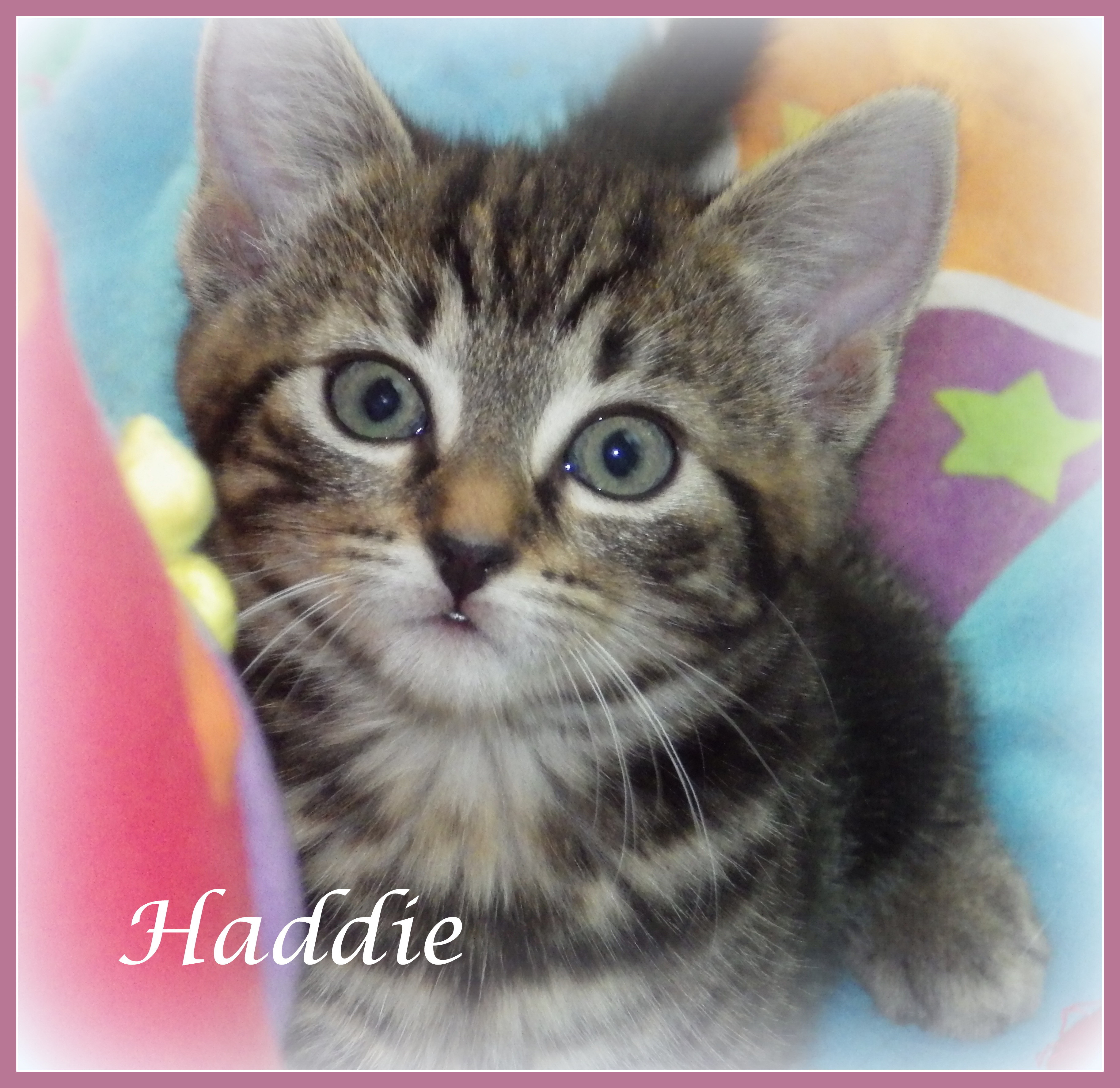Haddie is a beautiful, playful and friendly little girl who gets on well with other cats and kittens. Loves to run and hide with her sister and brothers, Hannah, Hugo and Howie.