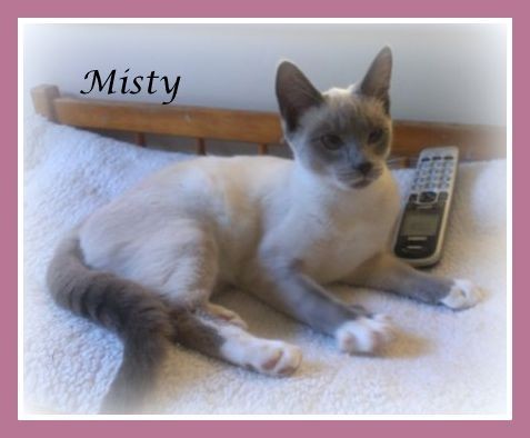 Misty is a beautiful lilac point Tonkinese cross. Like her sister Bridget, she very much enjoys human company, but as is the case with many oriental breeds she isn't overly fond of nursing and cuddles. She does however love to sit with her people for pats and scratches, while purring loudly and giving lots of head butts.