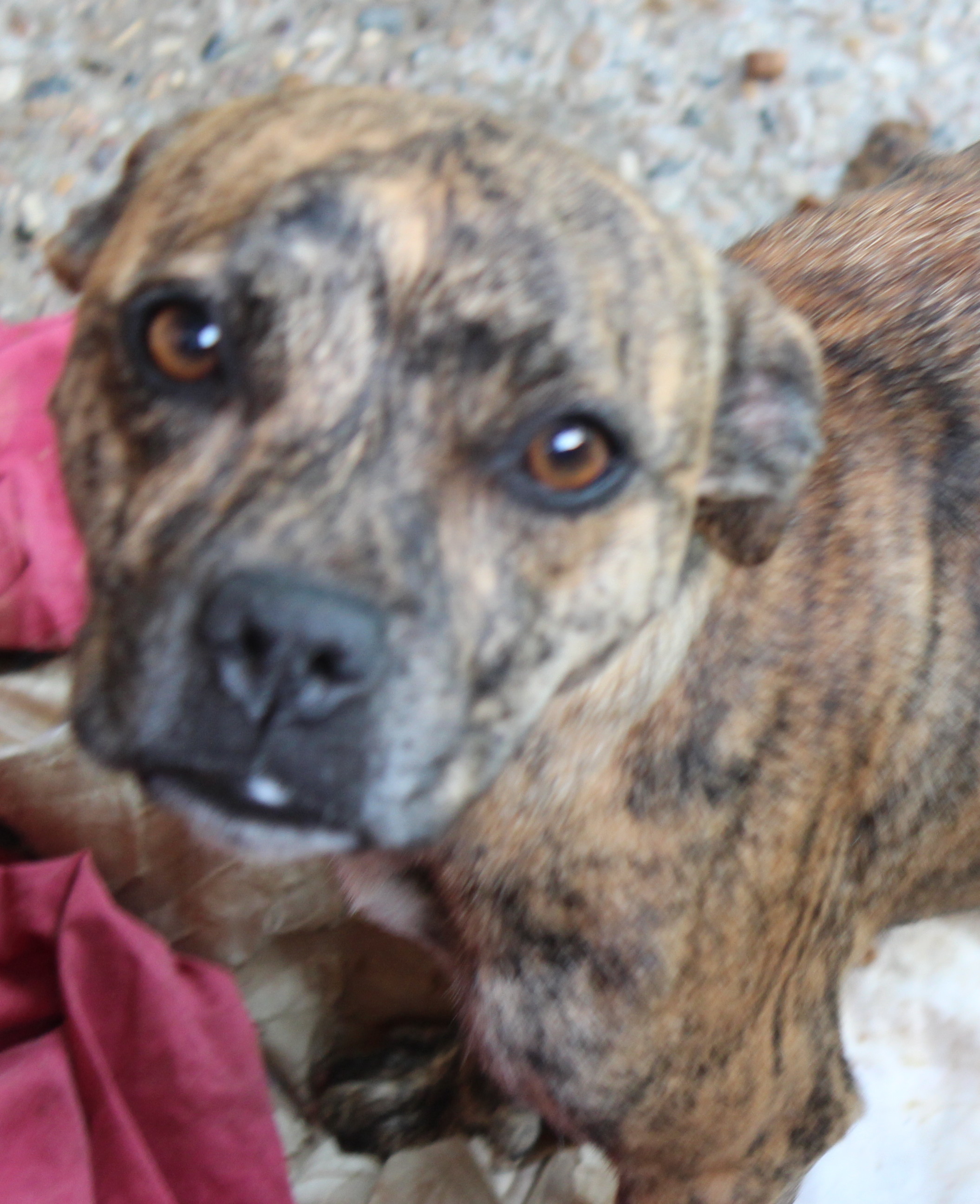 She is a suspected Staffy x Fox Terrier, basically she looks like a fox terrier with a staffy head. She is the size of a fox terrier, only being about 5-7kg