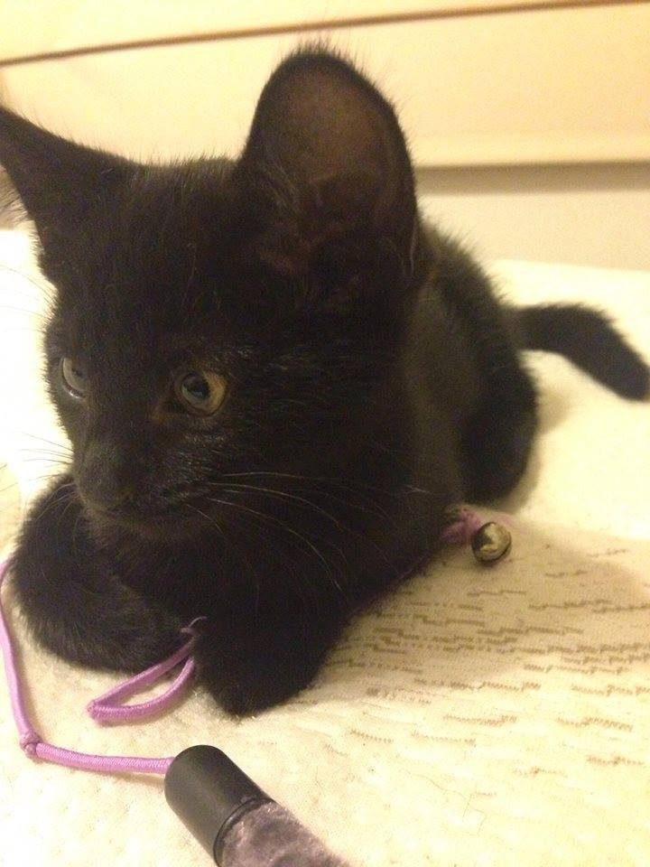 She is all black with beautiful green eyes and fur soft as silk! You can lose hours sitting and patting this little gem.