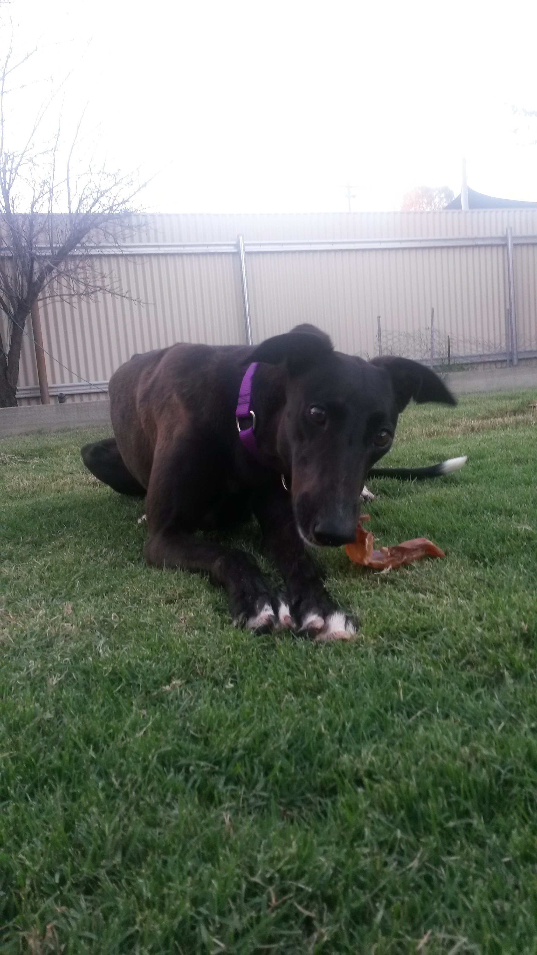 Crystal is a beautiful 2 yr old greyhound. She can be a little shy at first but has a placid nature and loves to play. Great with kids and other dogs, very excitable around cats as all she wants to do is play with them, but is cautious of them too( she does not hurt them!). She loves balls, toys and hiding shoes but most of all snuggling confront of the warm fire or on the master bed ...