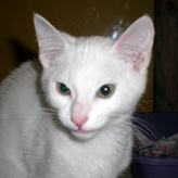 This very handsome pure white kitten, is definitely part oriental or siamese, he has that wonderful face and eyes that are so much a part of those breeds. He's very friendly, likes people and other cats and would love to find a home where he can be safe inside all the time. Pound no. 340 listed 26th june 2008