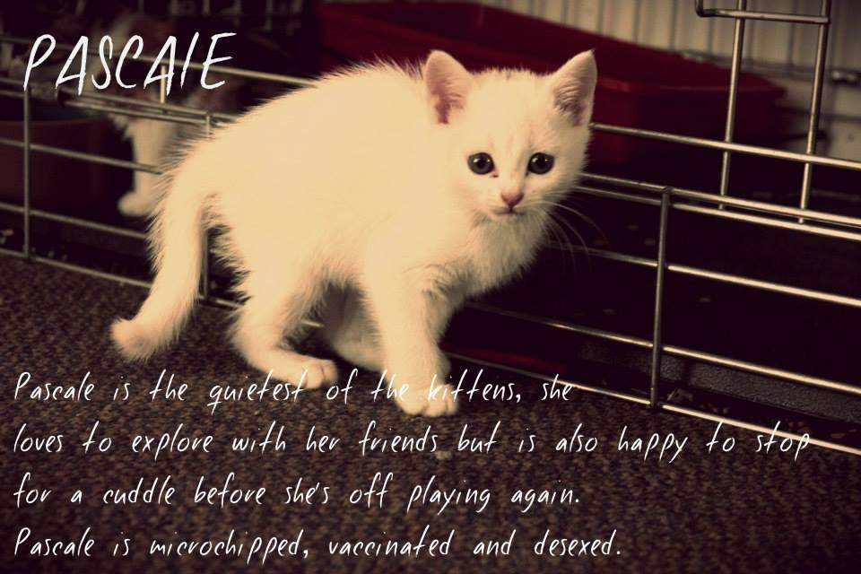 Pascale is a stunning 9 week old kitten. She is a bit quieter than the other kittens that she is in care with, but she still loves to explore and run around. She loves a snuggle and a cuddle. She has been well socialised, having met numerous dogs, cats and children. Pascale will easily fit into any home.