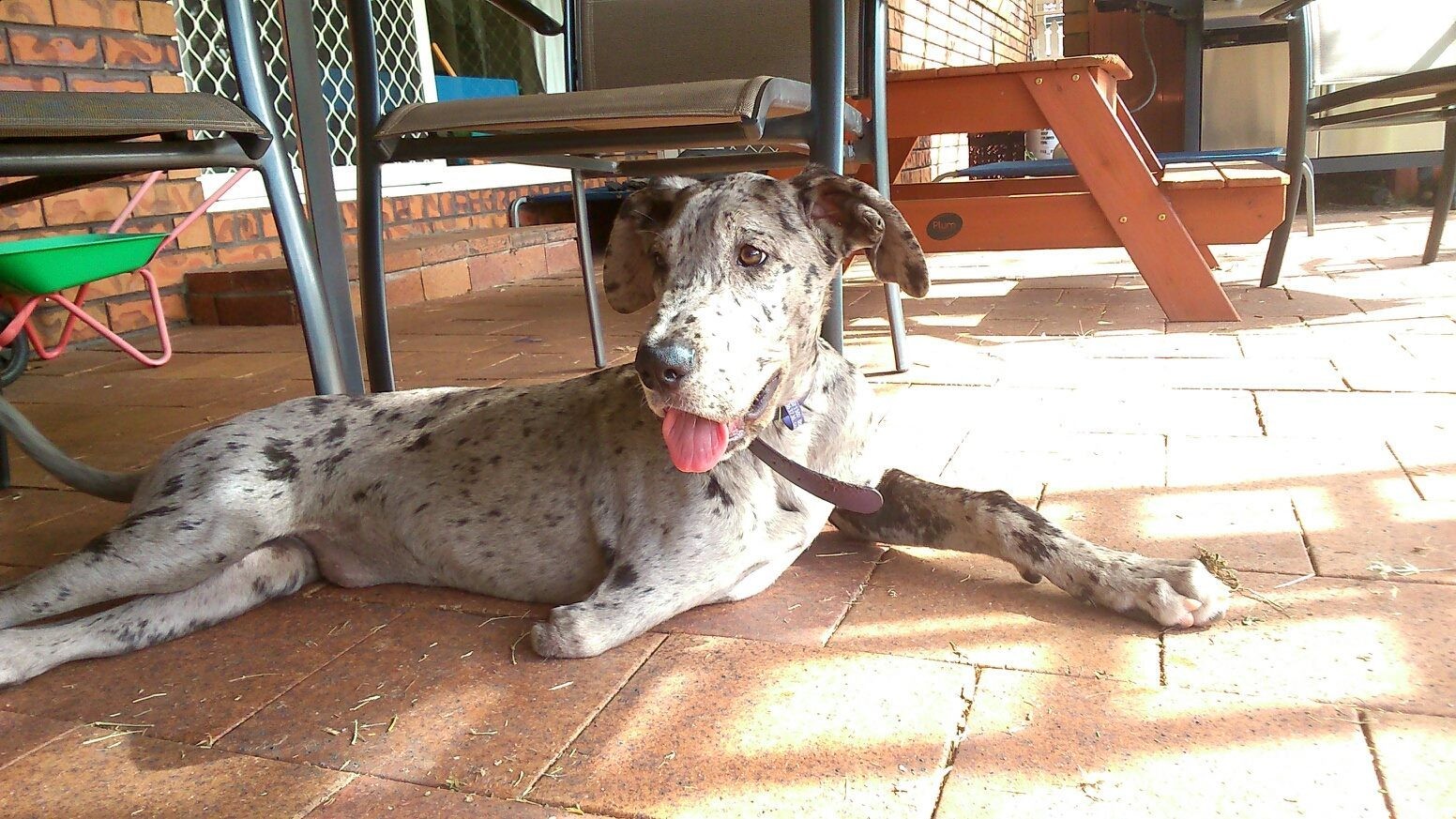 Sophie is a wonderful, happy, outgoing pup. She is full of affection and adores snuggles on a lap. Despite being born with only three legs she plays hard with other dogs. She is clever enough that when she has had enough she goes to a safe place to rest or watch. Sophie will need to be kept on the lean side to minimise the weight placed on her good front leg however she will only ever be a tiny dane so this should not be an issue. She uses her stumpy leg for balance and to position toys to her satisfaction. She is quite the talker, particularly when asked to move out of a warm, comfy bed. As she is still a puppy she does love to chew things however is easily redirected from inappropriate items to good toys. She runs very fast and although she may look as though she is having trouble walking she is very well adapted to her situation. She has been checked by a vet regarding her missing leg, they are happy with how she is managing.