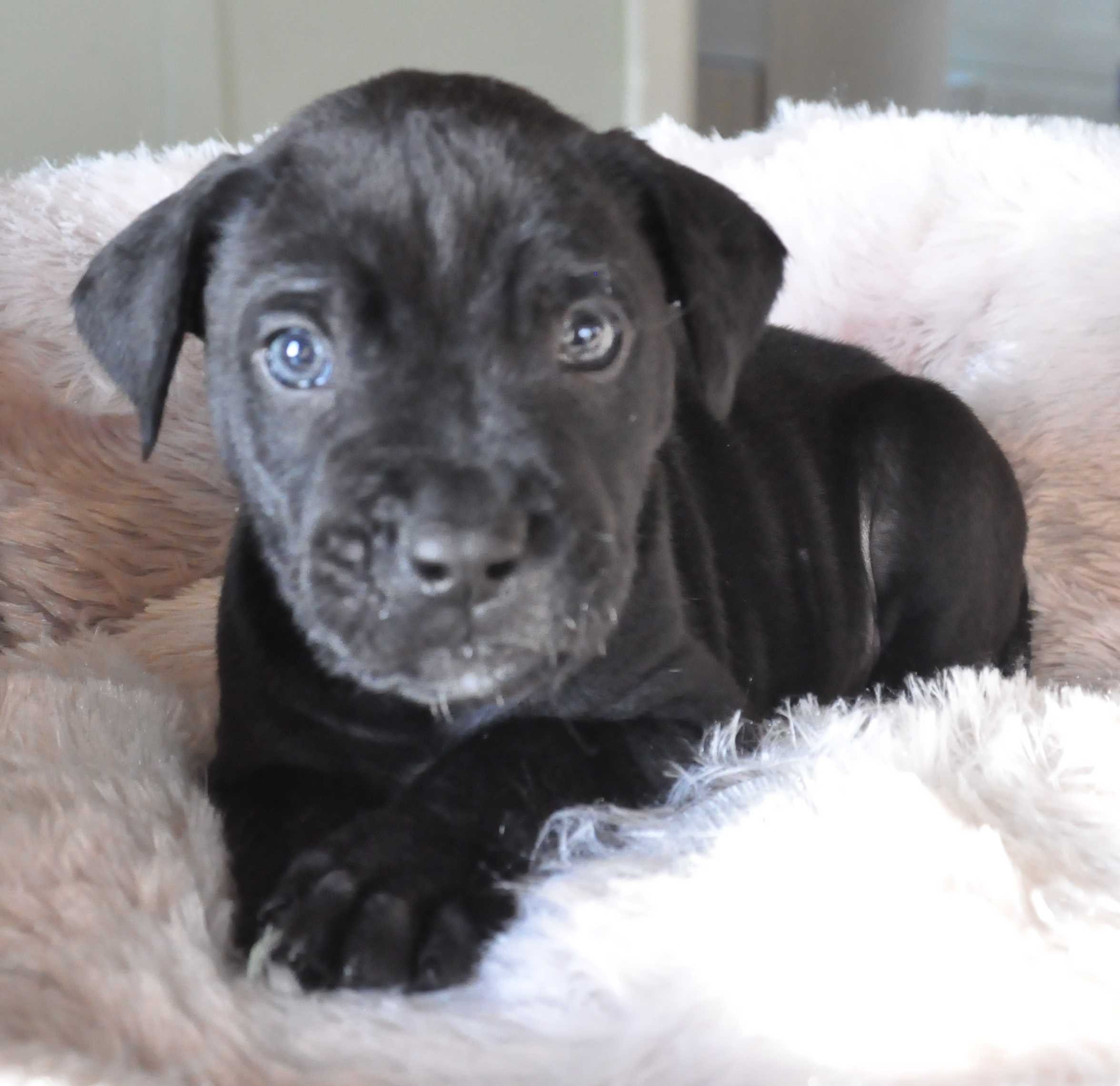 Boo is a the smallest of the male pups and tends to be a bit shier than the other two. He is a quiet snuggly boy. He was found in a box with his 2 brothers and 2 sisters on a cold wet night. The pups have been raised around young children, dogs and cats. Booloves his food and a good chew on raw hide.
