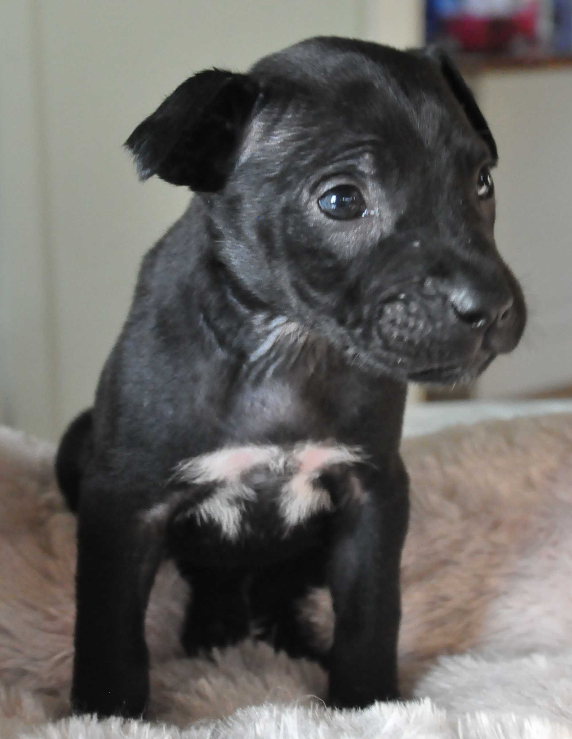 Peppa is a gorgeous little black staffy who loves her food and chewing on raw hide. She was found in a box with her 3 brothers and sister on a cold wet night. The pups have been raised around young children, dogs and cats. Peppa is the larger of the two girls, but much smaller in build than the boys.