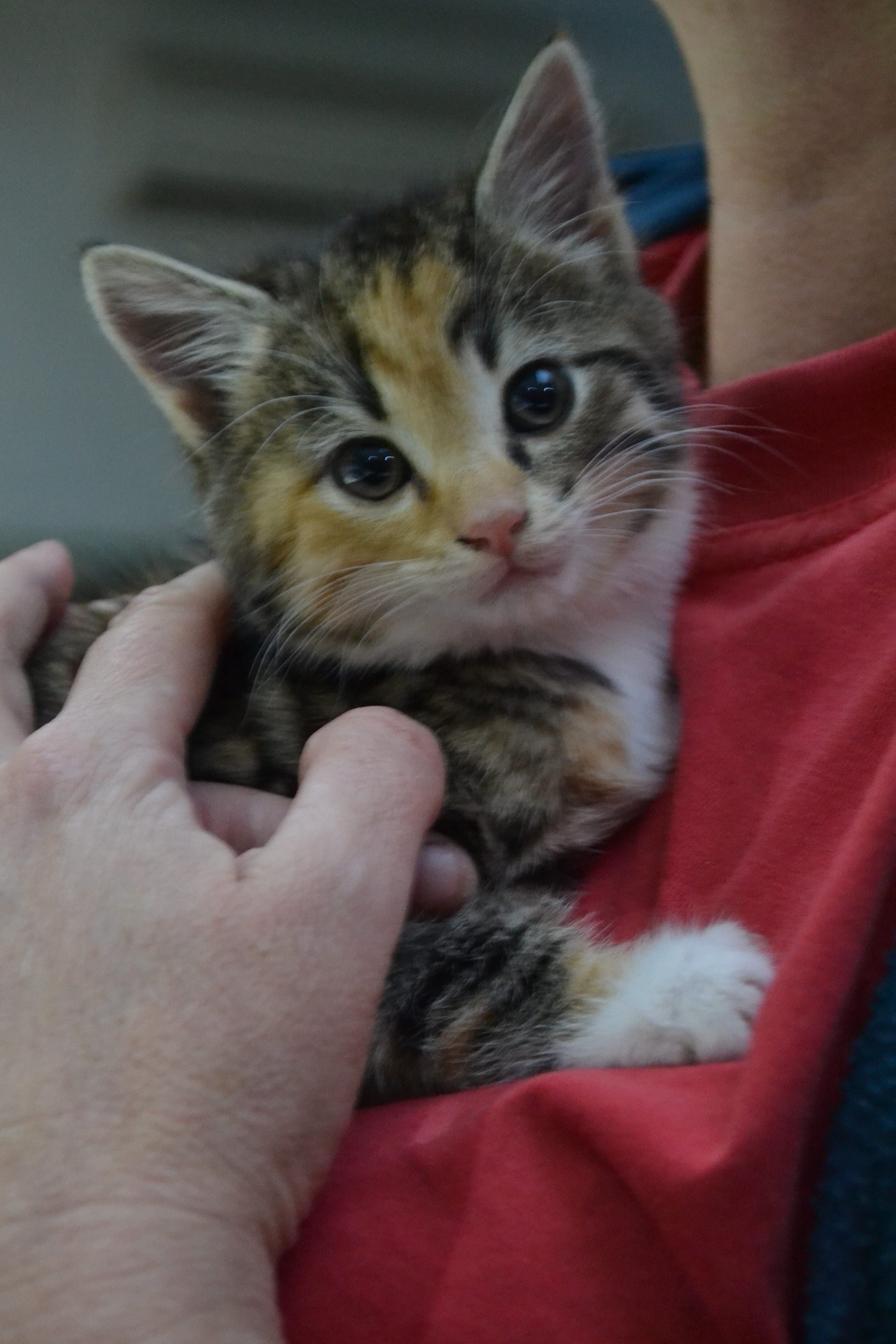 She has stopped her hissing and will relax in your arms after some patting. In no time at all, we are sure Tori will be a loving little munchkin!