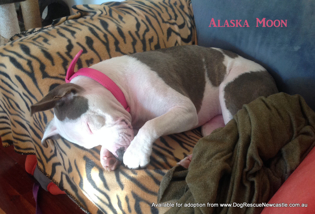 Introducing Miss Alaska Moon, a cheeky 1 year old blue and white staffy who will charm your socks off. If you are a staffy lover you will adore her typical goofy staffy antics. She will talk and snort in excitement to see you, and loves to tell you to hurry up and get ready for walkies. Alaska Moon is a lounge lizard and snuggler and is content to lay on or next to you all day. If you let her, she gives you big kisses to show you how much she loves you.