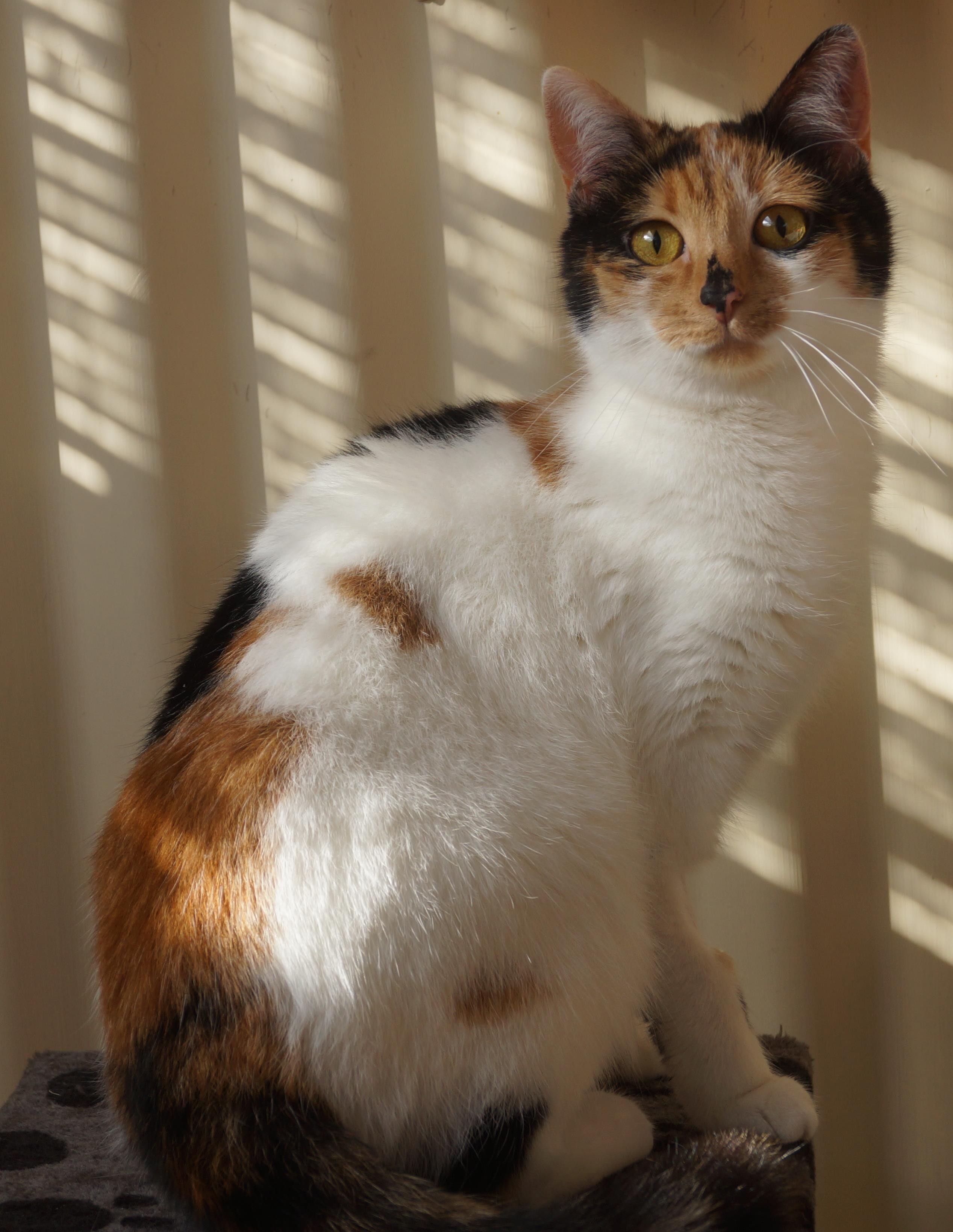 Meet Sarina (C710) the female domestic short haired white torti cat. Sarina is a quiet girl and she has recently been desexed.