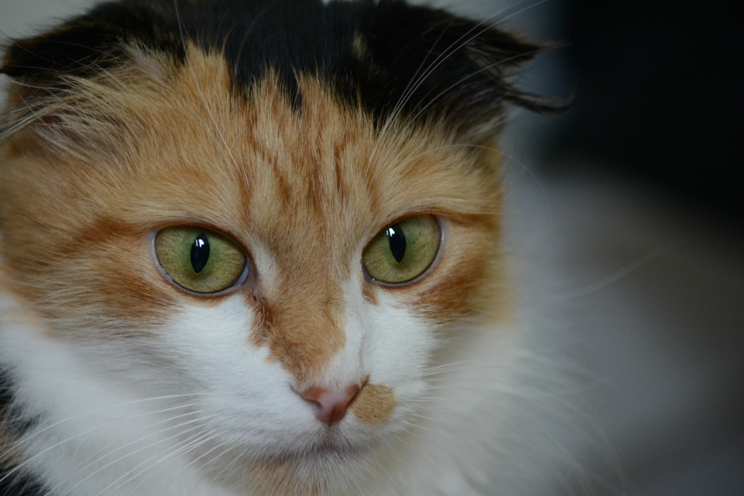 The first thing you will probably notice about her are her ears. She is part Scottish Fold, meaning her ears are strangely folded down. This causes no health concerns and makes her quite a rare and special cat. Her colors and markings are striking and quite magnificent.