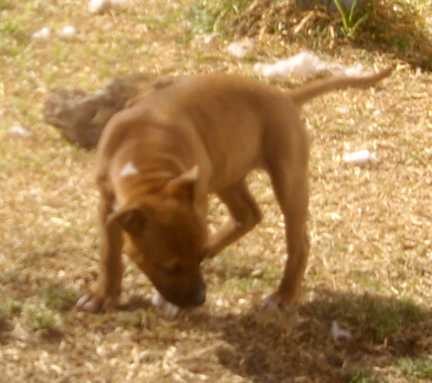 A happy playful puppy - good with other dogs but is better suited to a single dog family. She runs up to me for attention and enjoys a pat but is not real fussed on being picked up and held. She is active and will need more training to see her develop into a suitable family dog.