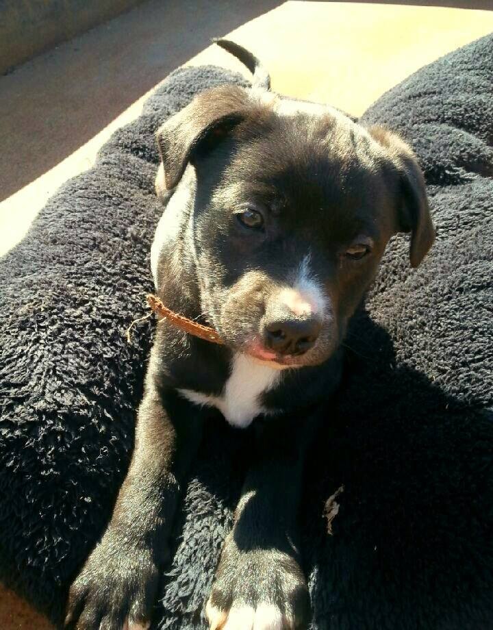 He arrived with his mummy from an awful puppy farm to the shelter and into rehabilitation and vetting at UNC. The dogs at the puppy farm were staffies, pugs and mixes of both so we are not quite sure of their breed exactly. The other rescue puppies from the same place have grown into medium sized staffy x gorgeous beings.