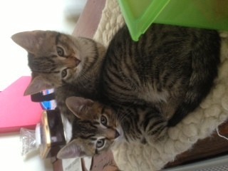 Buddy and Maggie are both playful, friendly and just plain gorgeous kittens. They are getting used to seeing dogs outside the door, but so far they have not had any face to face contact with the dogs. Buddy and Maggie have also been exposed to young children and they have taken this in their stride.