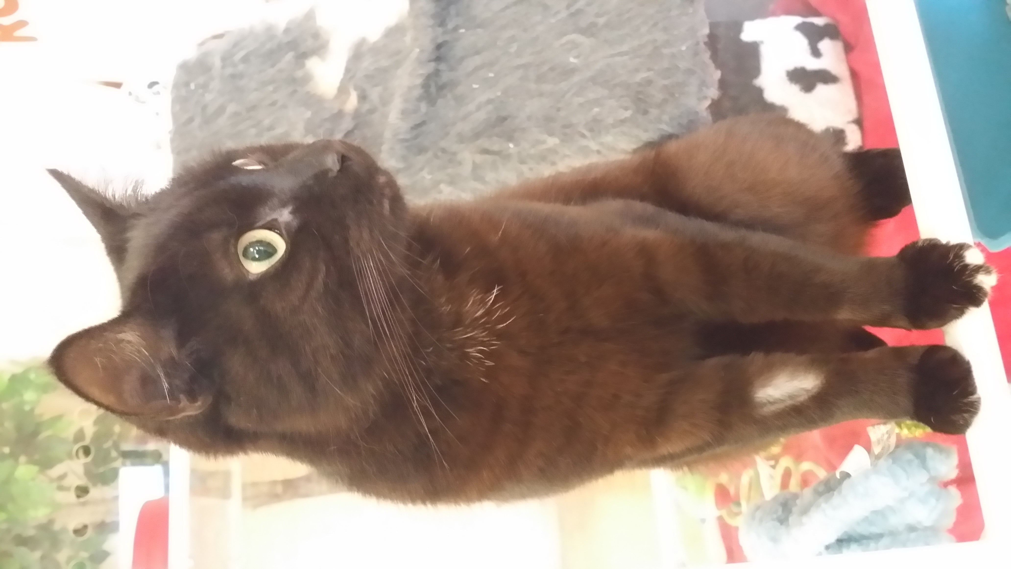 He is a dark chocolate brown colour with a beautiful soft coat. He is not particularly fazed by other cats or dogs, but would need to be slowly introduced to either.