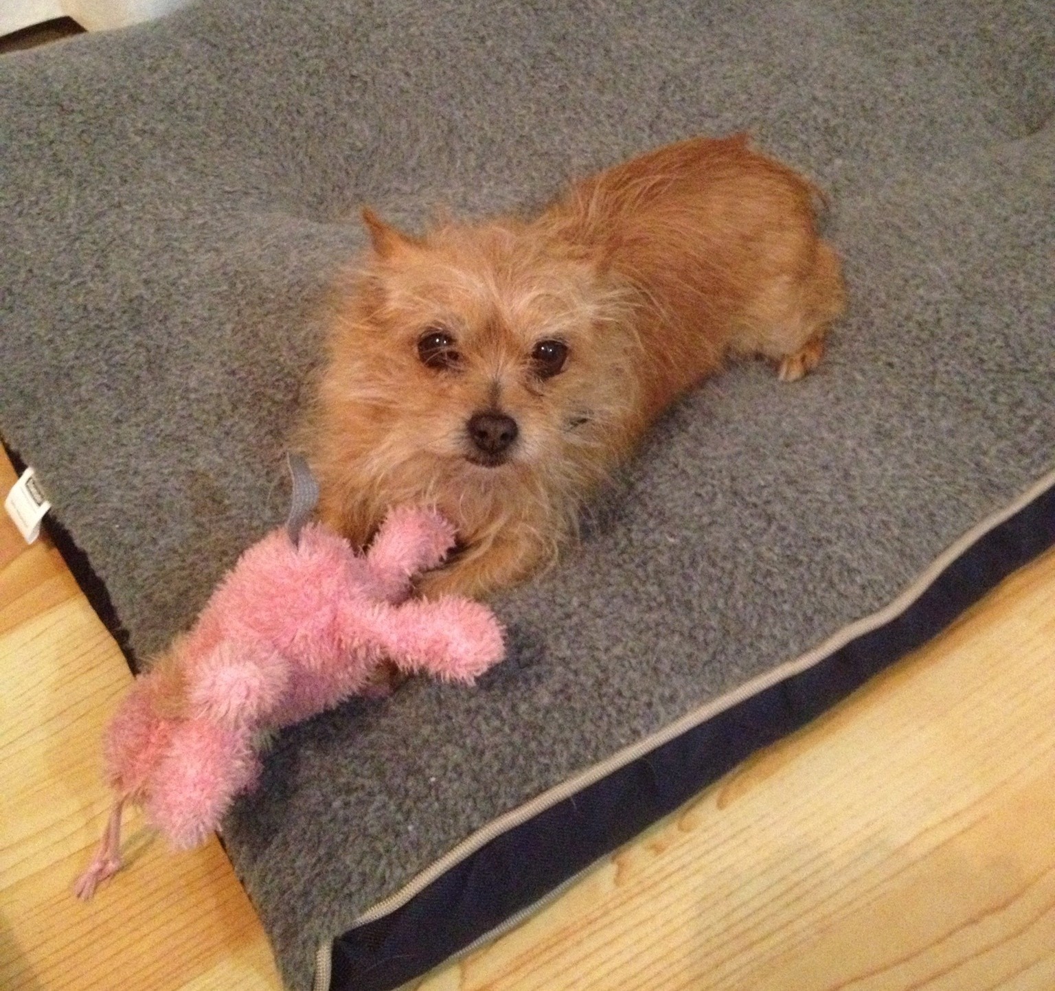 Gidget is playful , is the size of a Chihuahua, loves her pink teddy and carries him around everywhere , is crate trained & sleeps there every night , is house trained , lives with 5 other dogs in my home & loves to hang out with her two buddies both Chihuahua crosses., snores away every night when sleeping , loves to meet new people with an eager wag of her tail , loves her food , and adores being close to her humans. Gidget is not a yapper & is quite independent .