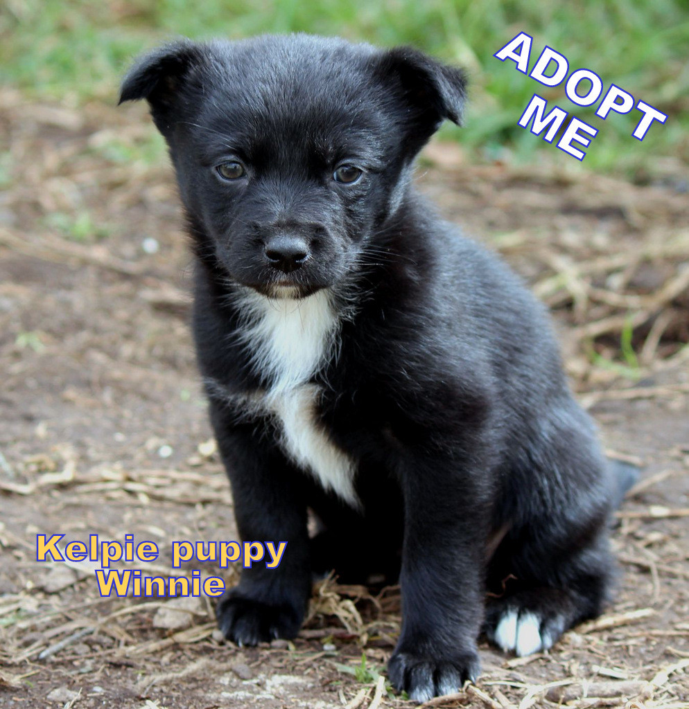 Winnie is a 9 week-old kelpie puppy, all black with a white chest. She has a very sweet personality, and loves to be picked up and cuddled. She was originally smaller than her 3 other siblings, but has grown quickly and caught up with the others. She is expected to grow to a medium-sized dog.