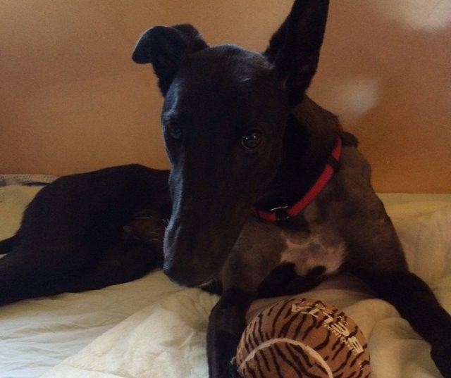 10 month old Rusty is a playful, affectionate and funny dog. He loves the beach, fetching balls and playing in the waves. He is gentle and is getting used to life with inside cats. He loves other dogs and would be perfect as a companion pet. Rusty required a shoulder operation which meant he was never fit for racing and was due to be put down, however Friends of the Hound volunteers came to his rescue and raised the funds for his operation. Rusty is now recovering well on the Central Coast and is currently in foster care with his best mate Gus.