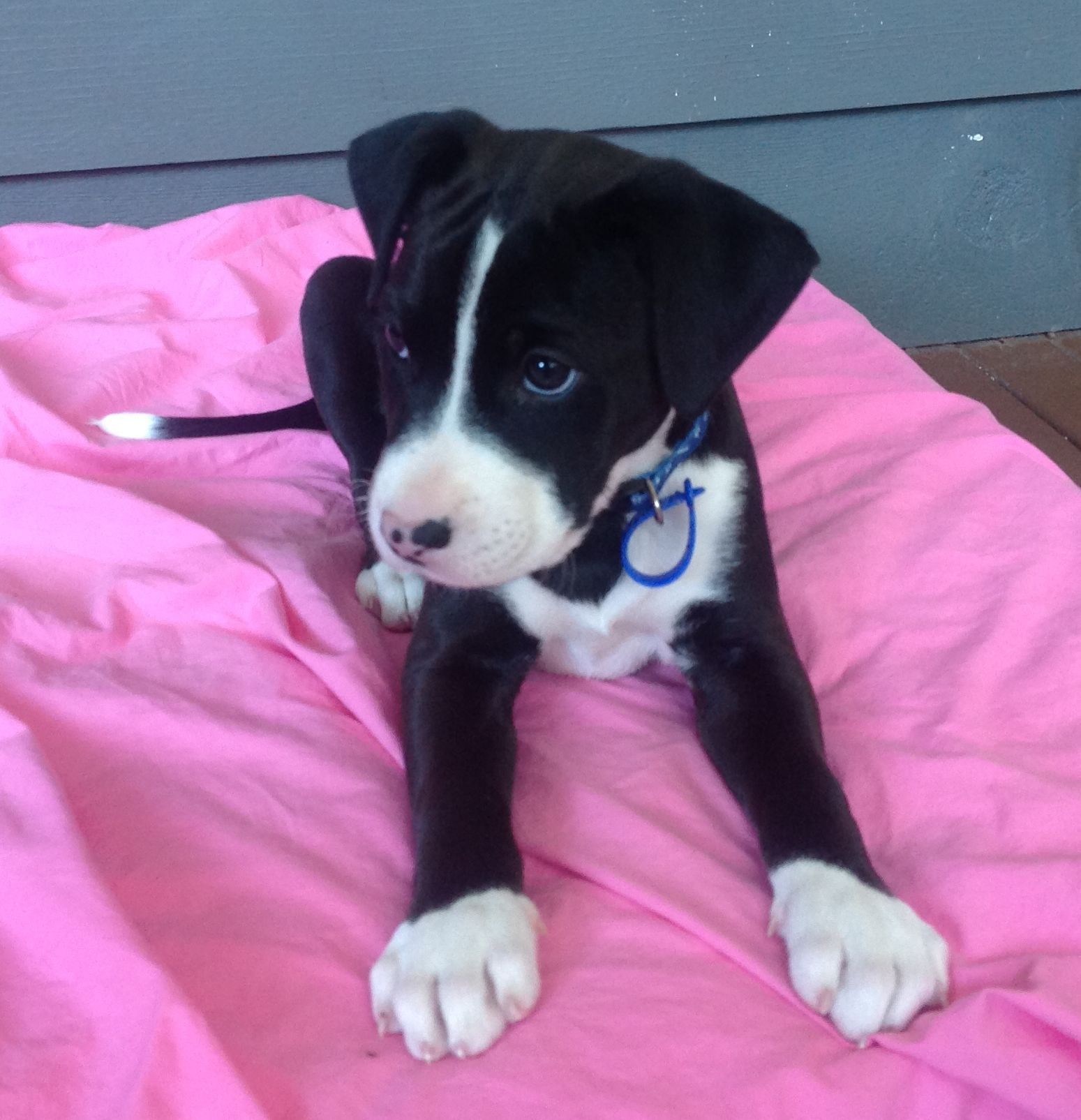 Scout would best suit a furever home with another friendly playful dog of any size or someone who is home a lot if there is no other dog to play with. Scout is very social and will cry without human or canine companionship. Scout is child friendly so he would also suit a family with slightly older kids. Being the runt of his litter, he is smaller and slimmer than his litter mates - although he will most likely be still be large when full grown. Scout has a very short coat and is slender so he needs a jacket to keep him warm during winter. Scout must be allowed inside with his family and must sleep inside at night even when older.
