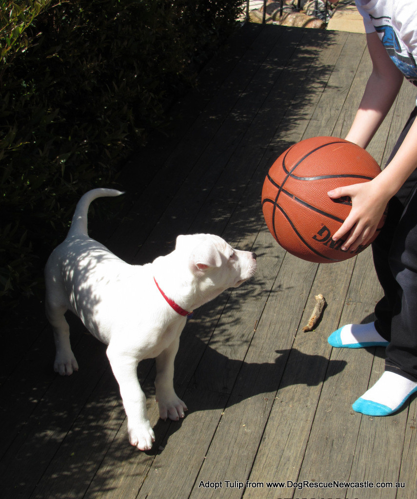 Tulip is going to be a large dog and she will need a large yard, 6ft fencing and good exercise. She will also need sun care because of her colouring, especially on her nose and ears.