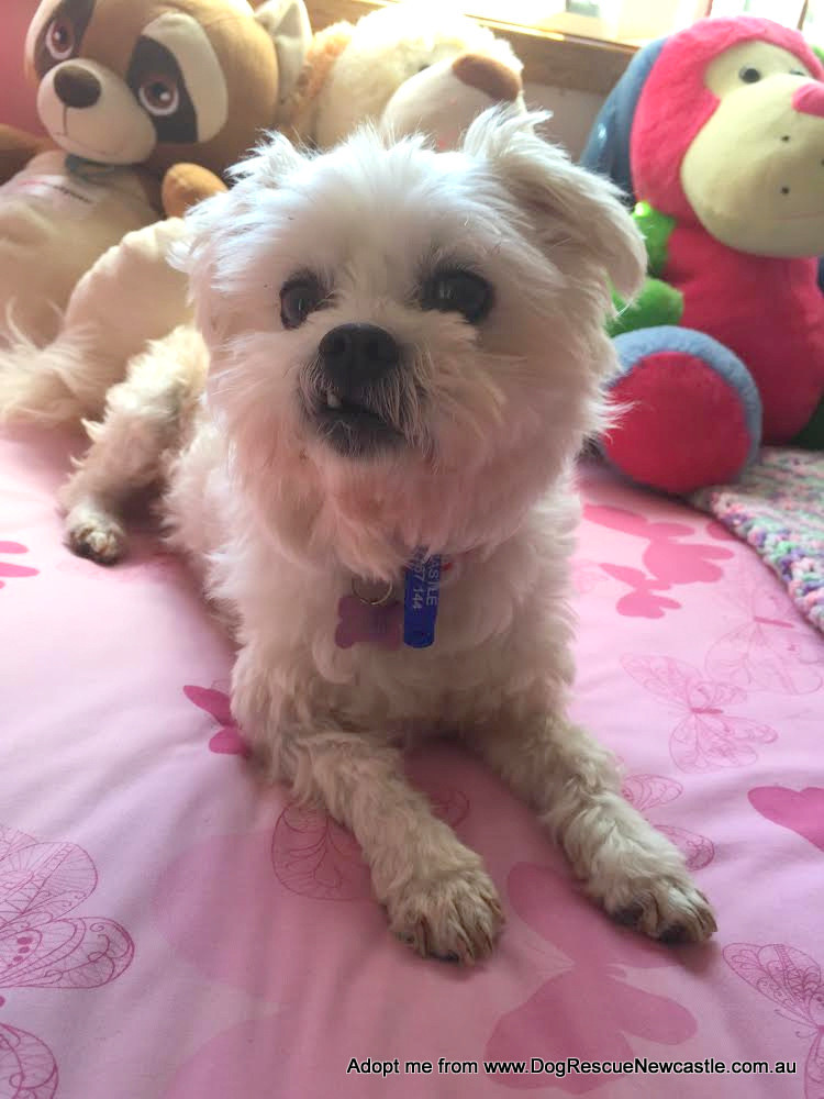 Sally is a tiny, 6 year old, Maltese cross. She has a very bubbly personality and loves cuddles. She is an inside dog. She's housetrained. She sometimes goes out and plays in the yard but is mainly inside. She is very good on the lead and enjoys a walk.