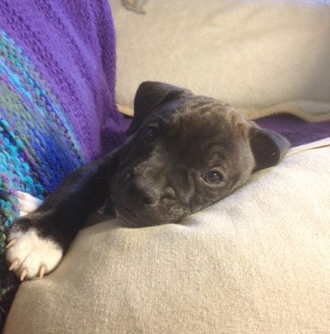 Kieran is a beautiful and gentle 10 week old, male English Staffy x puppy. \ Kieran has a dark brindle soft coat with a white sock on his left leg. Kieran has a gentle nature and absolutely loves his cuddles with his humans. Being the only boy amongst his littermates of 3 girls, Kieran is the complete softy of the group and thinks he is a lap dog – if your lap is free he’s there!
