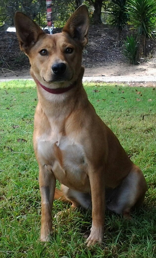 She is a 22 month old desexed female Cattle x Staffy who is great with other dogs and safe around cats. Bella has been at the shelter for ten months as no fault of her own she is a yellow dog ( not part Dingo ) She is a beautiful dog full of life and loves everyone. She has plenty of energy but has learnt to be respectful of her handlers. She walks nicely on collar sits waits and comes on command. Because we train our dogs and Bella has been with us for a long time she is well behaved. She is not a dog who barks much even in this environment and I have had her at my home where she was lovely to have around. She will make a great family dog who would enjoy trips to the beach and a home of her own. She is $ 310 desexed vaccinated wormed heartworm prevention flea protection micro chipped vet checked.