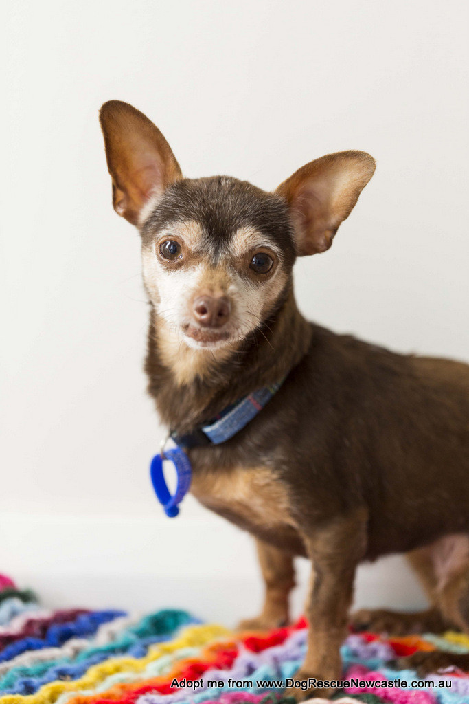 Shandi, female, Chihuahua x, approximately 9 years old, weighing only 2.5kg. She is a precious little flower who will be an ideal companion for a retired person who would enjoy having a loyal friend. Shandi likes to play with toys and relax on a soft cushion.