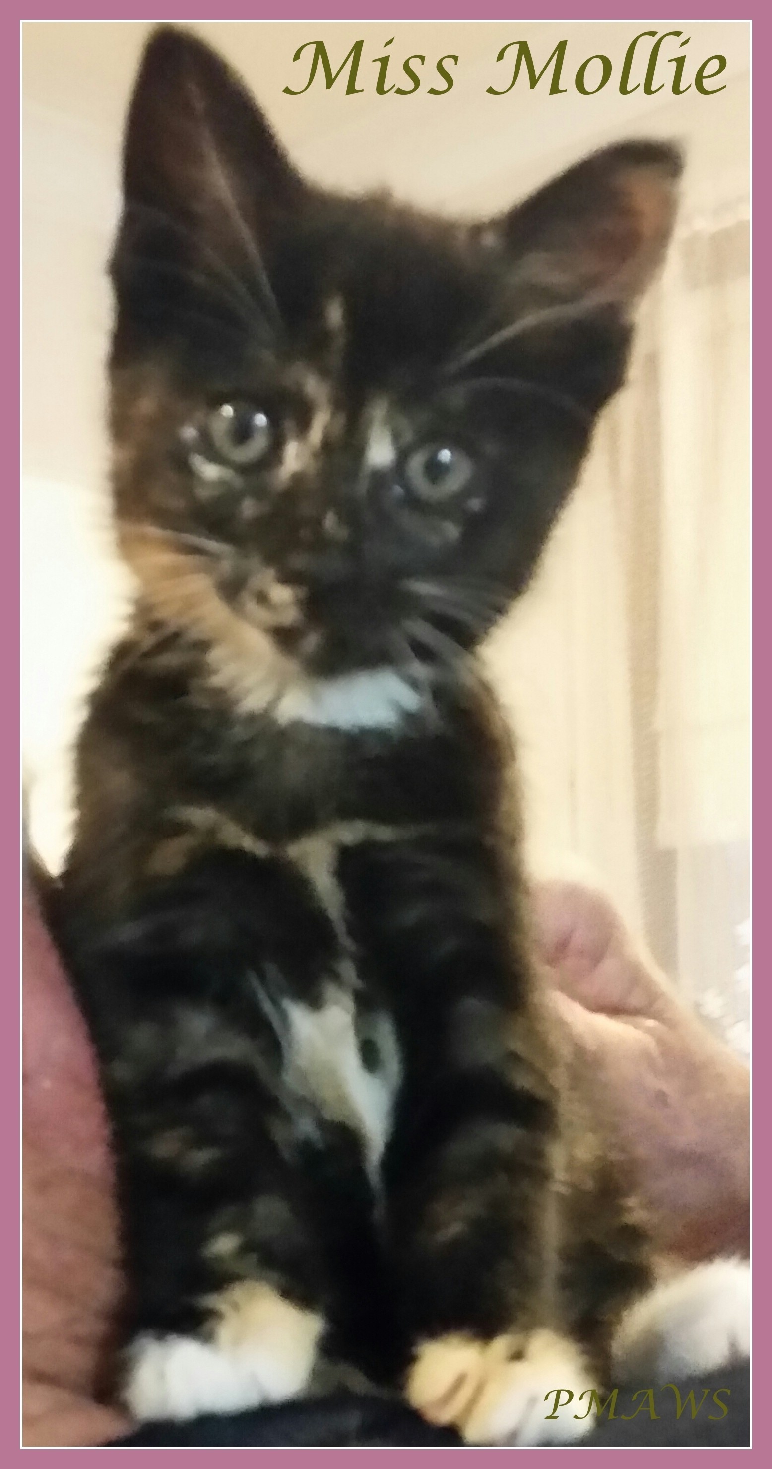 Little Miss Mollie is a beautiful dark tortie girl with white socks. She gets on well with her foster sister Miranda and they spend many hours chasing each other around the house. She will always find time for a snuggle with her humans.