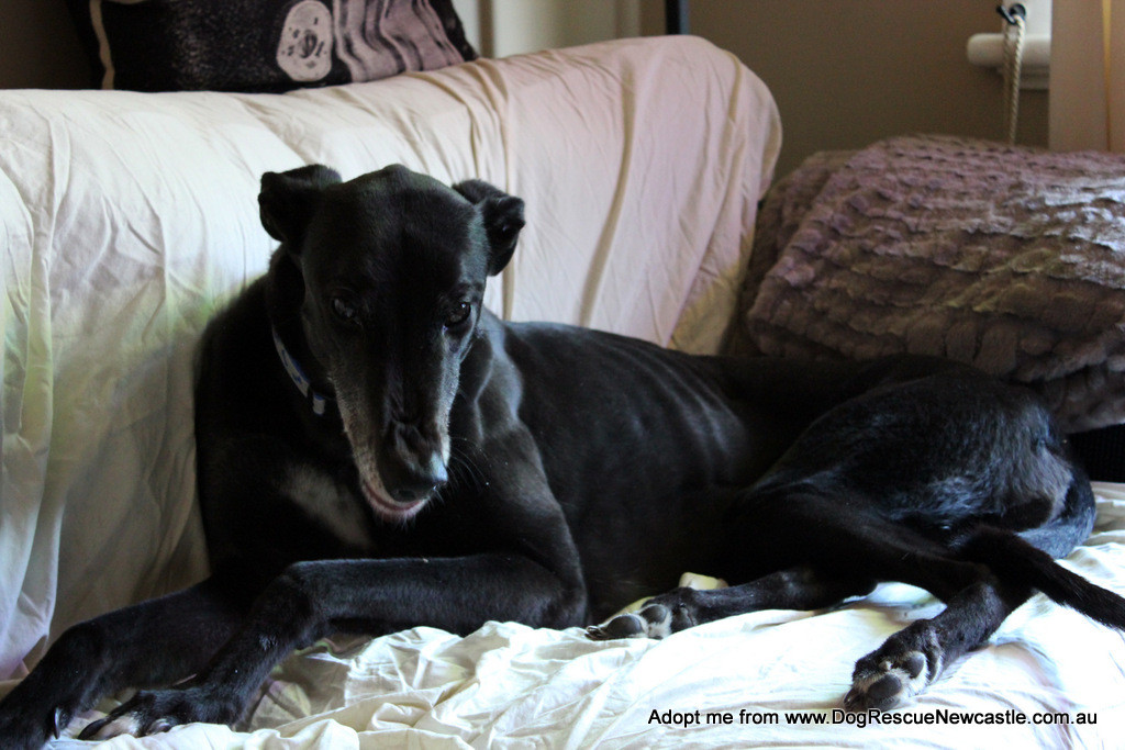 This is delightful Delilah. She is a 5 to 6yo purebred greyhound. She loves cuddles and pats and she will put her paw on you when she wants more. She is very placid and easy going. Delilah loves being a lounge lizard. She doesn't need a large yard or a lot of exercise.