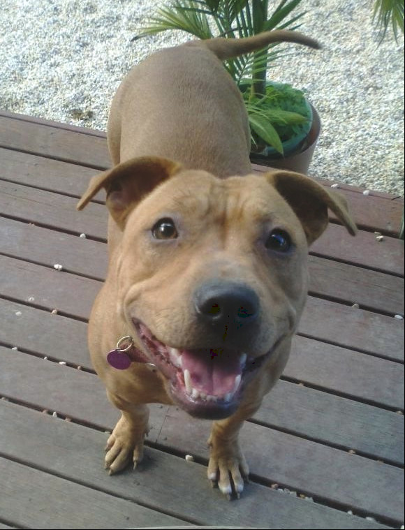 After a very rough start to life Zara has blossomed into a typical chatterbox, smiley-face, wiggle-bum staffy. She can be a little overwhelming for smaller dogs or dogs who like their space but she loves to play with larger dogs. This little chunky monkey weighs in about 18kg. She is a strong personality and will need a consistent pack leader to keep her focussed on being a good dog. She loves her walks, belly rubs, and playing with unusual toys (logs not sticks, bricks and a big chunk of carpet!) Because of her boisterous nature she is not suited to a home with small children/cats/pocket pets etc.
