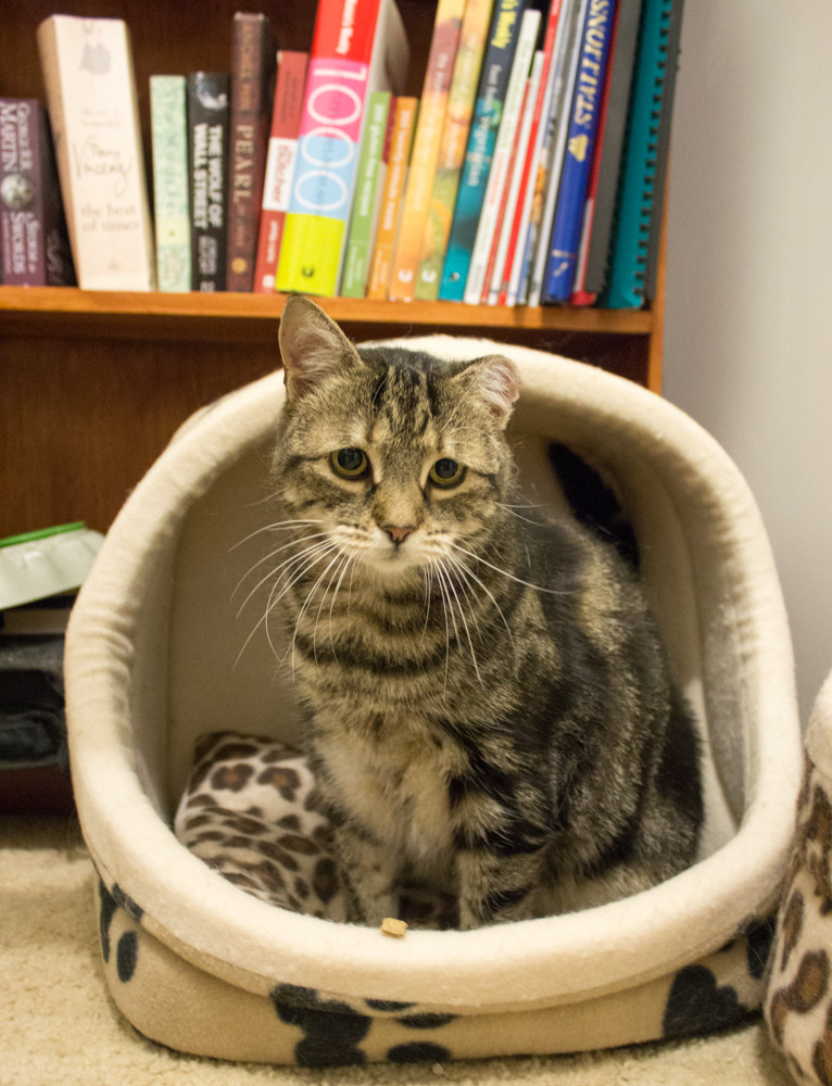 Mona is happy as an inside cat and has great house manners. She loves to nap on the bed and is a very relaxed cat. Her only issue is that she isn't too welcoming to other cats. So ideally she would be in an only cat household. She is a bit worried about dogs as well