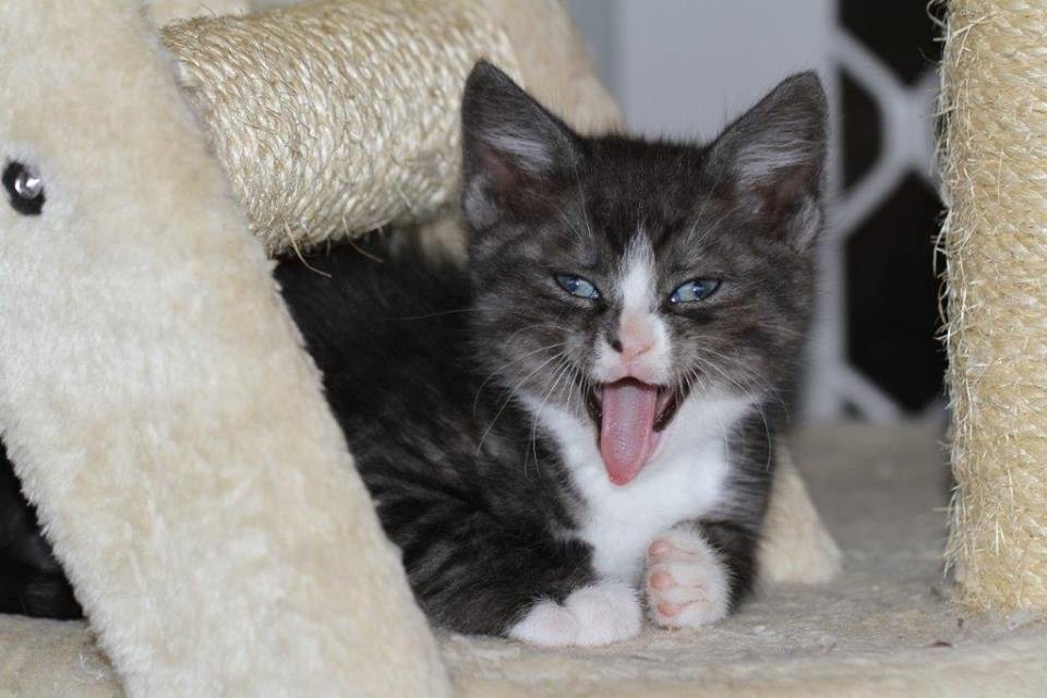 Kuma is a friendly kitten who comes for attention and loves playing with the other kittens and older feline friends. He is litter trained and eats his food well.