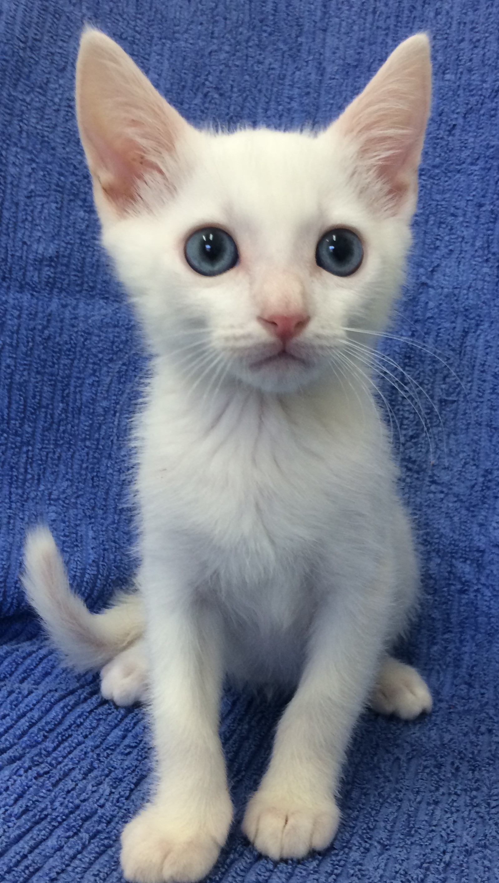 Snowy is very handsome. He has the most beautiful blue eyes that just melt your heart. He is a smoocher and loves to cuddle. He was bottle fed from 3 weeks old as he was found all alone. He is well socialised with dogs, cats and kids. Snowy will need to be a totally indoor cat due to his very pink skin.