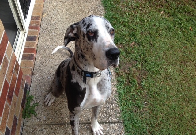 Indy is such a beautiful, sweet girl. She would fit in to a home with other great danes and small dogs, cats and children. Due to her age, she would benefit from some more training and is very willing to please, walks beautifully on her own and in the company of another dog. She does require a patient family to give her the time and space she needs to adjust to change. She travels fantastically and love, loves the water. She does require good fencing in order to keep her safe. Once you meet this girl you will fall in love very quickly, seriously who couldn't with a face like hers. Can I please ask that everyone makes first contact via email, it's a very busy time of year, we will get back to you ASAP but please keep in mind we have jobs and families also.