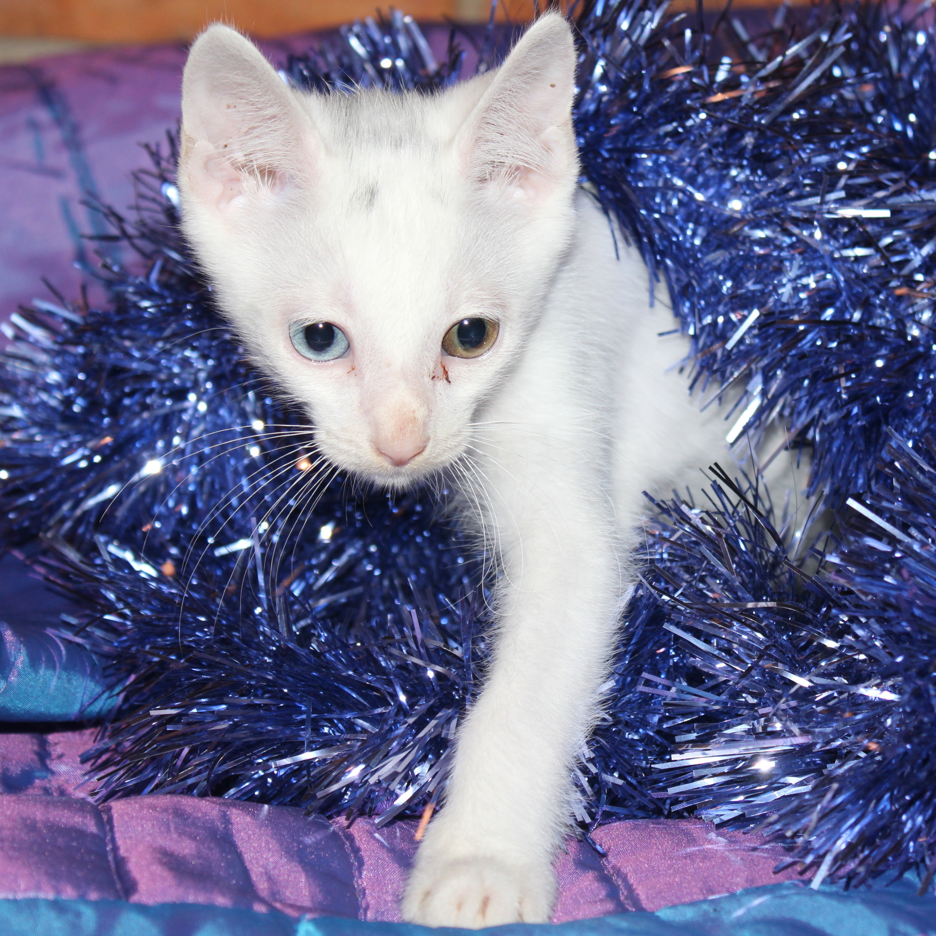 He has one blue and one yellow eye - opposite side to his brother.