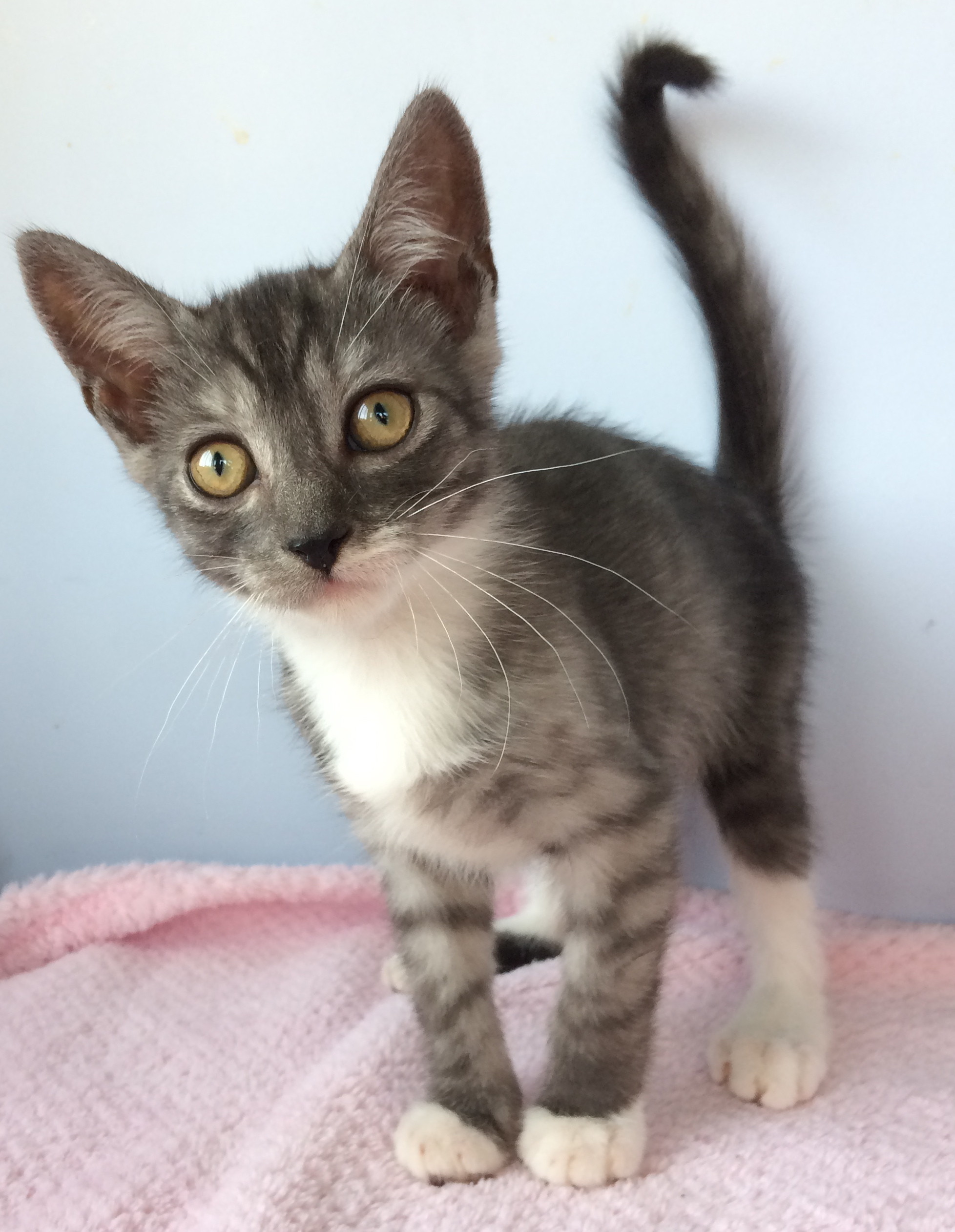 Arnold is a gorgeous Charcoal Tabby and White little boy. He is very pretty. Arnold is also cuddly and has lots of personality.