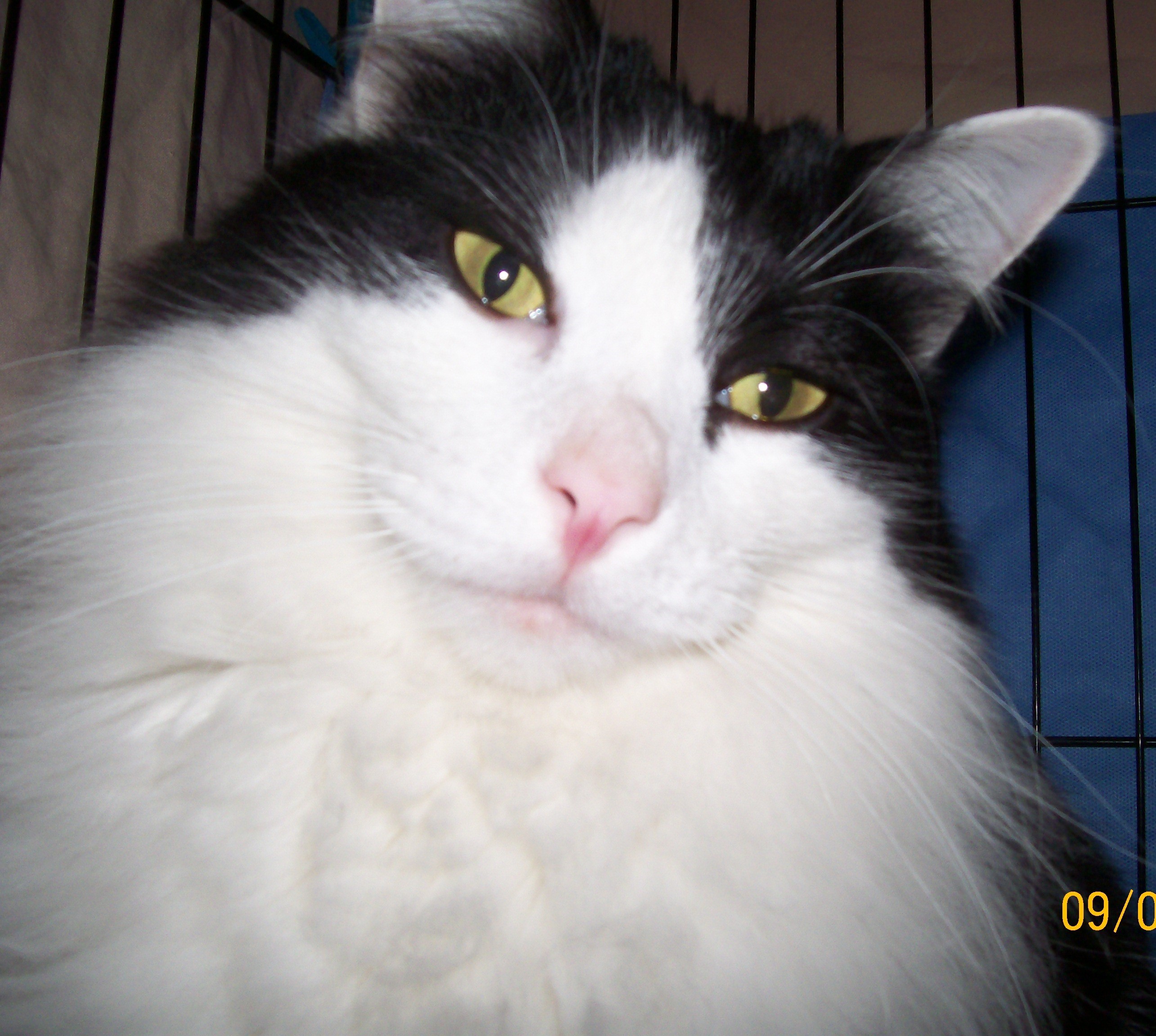 His coat is luxuriously thick and silky and a regular brush is a must. He is quite the looker with his distinctive black on white markings and handsome face and the most adorable fluffy pantaloons.