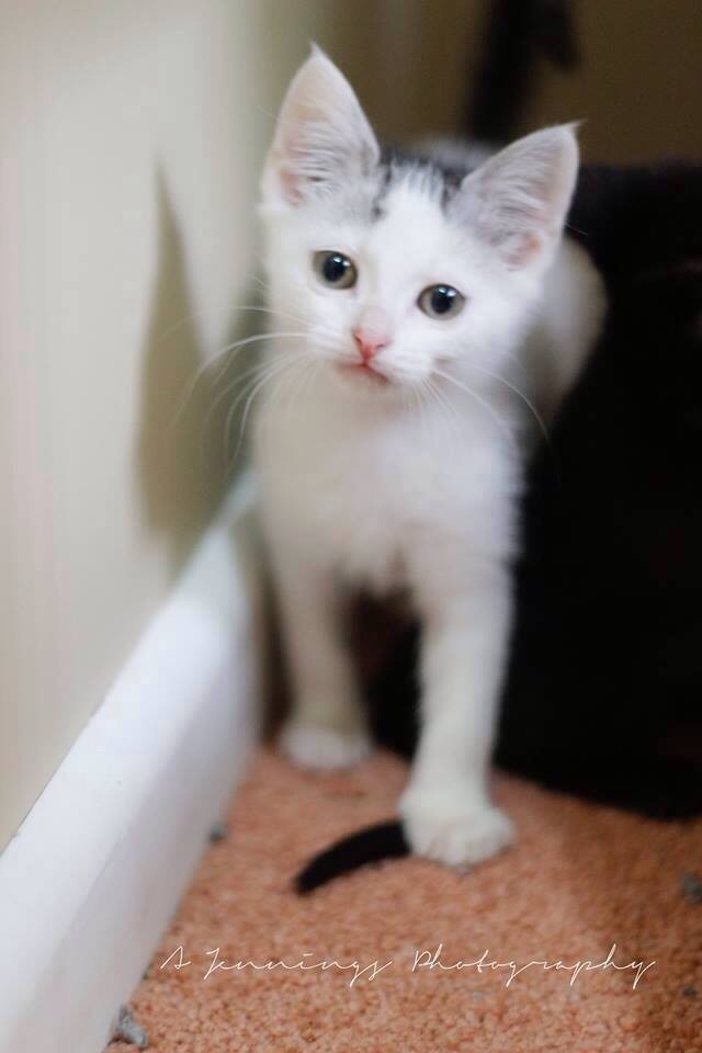 Ron is a 6 month old domestic short-haired black and white kitten. Like his opposing colours, Ron is a bit of a “Jekyll and Hyde” character, showing two sides to his personality. He is the first to greet you every time with a very loud purr and attention-seeking meow, however is also the first to run and hide if frightened or if new faces greet him. It doesn’t take him long though to become comfortable with someone once he feels safe. He loves attention however doesn’t love cuddles so won’t be one to climb on your lap, but will give you plenty of affection by rubbing against your legs. Ron loves playing with his two siblings, yet is also quite independent so will often play on his own with toys or boxes. He is the most adventurous of his siblings and would enjoy a home with plenty of places to explore. He would be best suited as an indoor cat due to his pink nose, which would be prone to sunburn. Ron is excellent with children and would adjust well to a home with or without other pets.